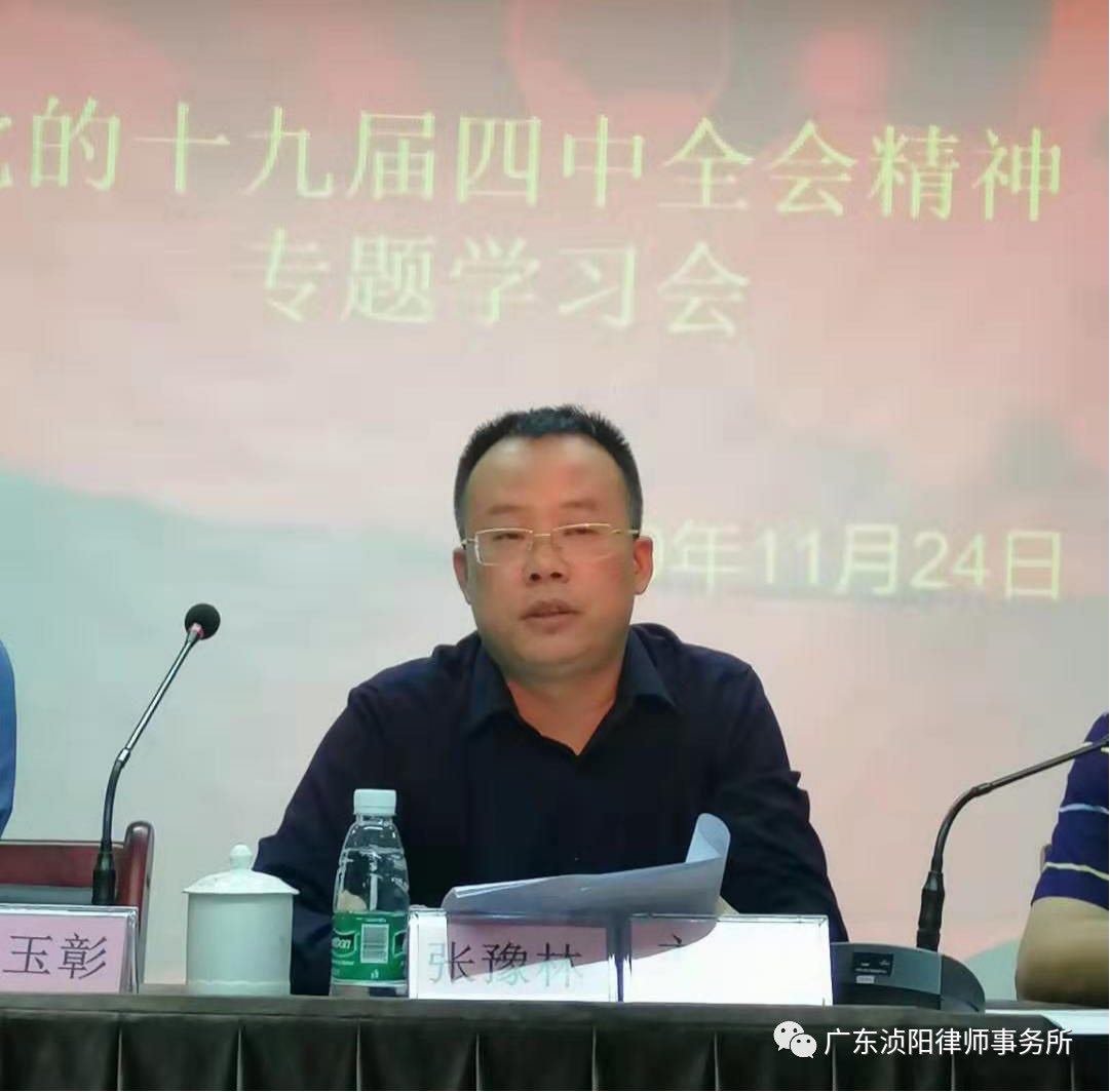 2019年11月24日晚,英德市司法局组织清远市片区(英德)54名律师,在广东浈阳律师事务所会议室,学习党的十九届四中全会和全省律师行业“不忘初心、牢记使命”主题教育汇报会会议精神。清远市律师协会副会长张金青、清远市律师协会监事长张豫林,英德市司法局党组成员、副局长王立兵,英德市司法局公共法律管理股股长牛玉彰等出席会议。会议由张豫林律师主持。