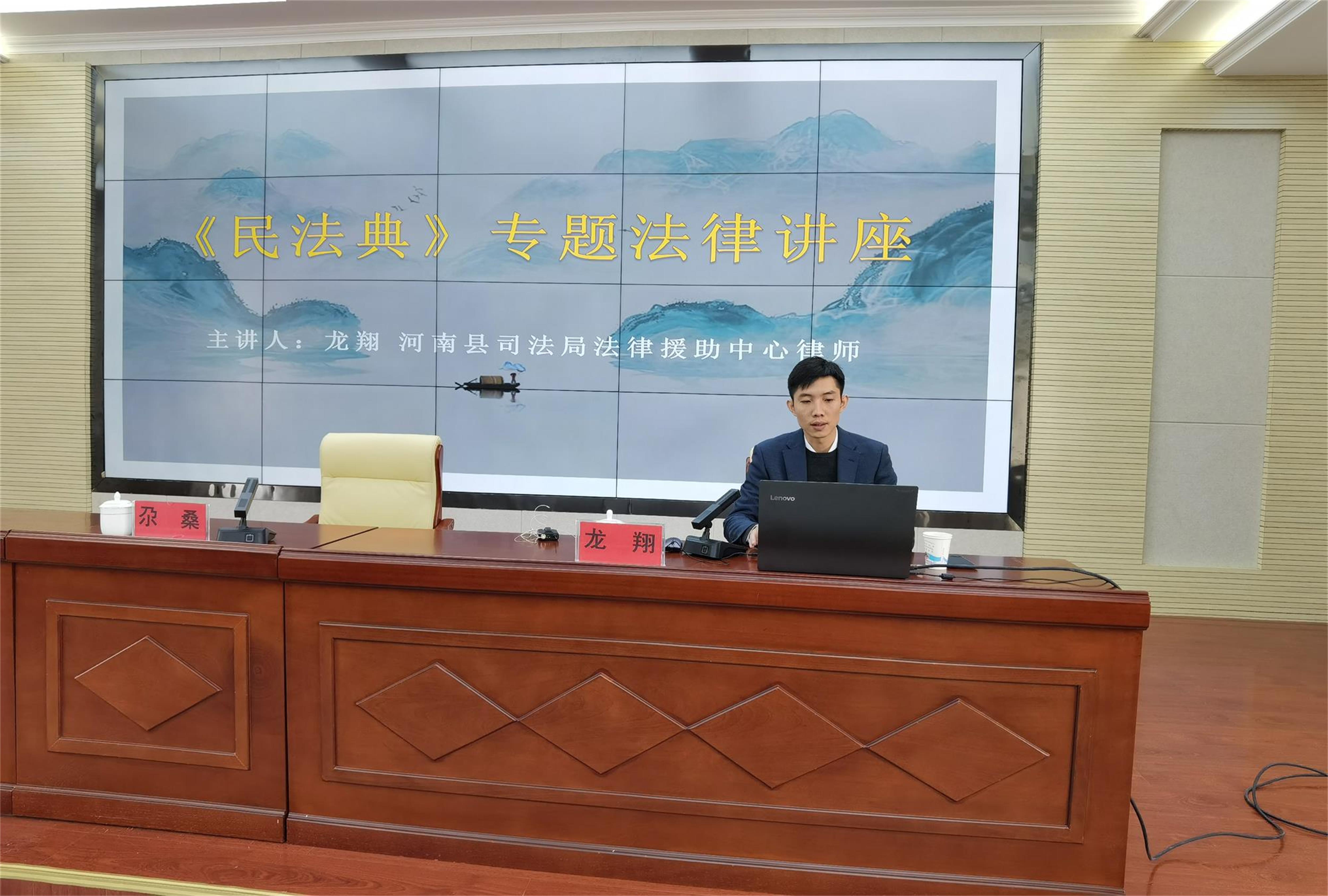 为贯彻落实习近平总书记《充分认识颁布实施民法典重大意义, 依法更好保障人民合法权益》的讲话精神,促进服务地青海省河南县法治政府工作的推进。2021年3月18日上午,我所“1+1”中国法律援助志愿律师龙翔为河南县政法部门干部职工开展《民法典》专题学习讲座,河南县政法委书记万马乃同志、河南县法院院长华青太、河南县检察院检察长拉加才让、公安局局长娘吉才让、河南县司法局局长尕桑等主要领导出席讲座。