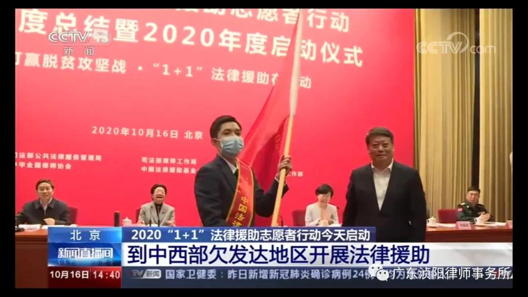 2020年10月16日,“1+1”中国法律援助志愿者行动2019年度工作总结暨2020年度启动仪式在北京人民大会堂金色厅举行。十届全国人大常委会副委员长顾秀莲、司法部部长唐一军、副部长熊选国等领导出席会议。广东浈阳律师事务所青年律师龙翔作为全国法律援助志愿者代表,担任旗手,从司法部部长唐一军手中接过志愿者旗帜,正式成为中国法律援助志愿行动2020年度律师志愿者,将在青海黄南藏族自治州河南县从事为期一年的志愿服务。